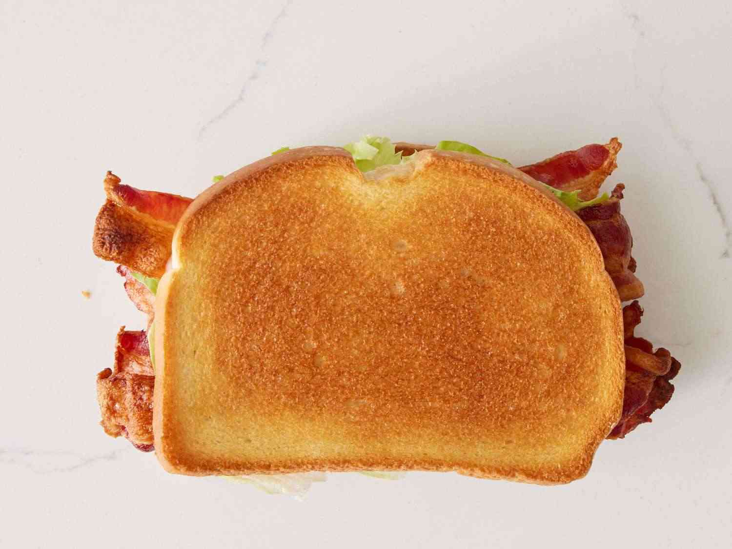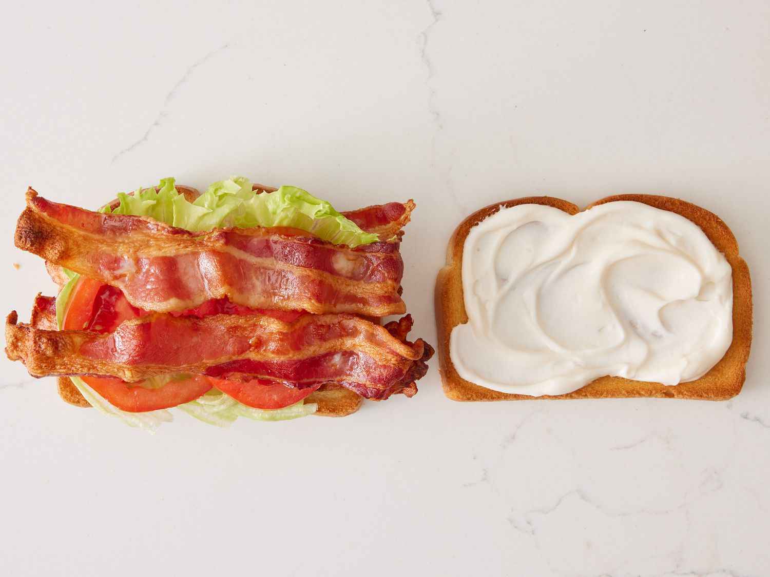 Arrange cooked bacon, lettuce, and tomato slices on one slice of bread. Spread mayonnaise on the other slice of bread. Dotdash Meredith Food Studios