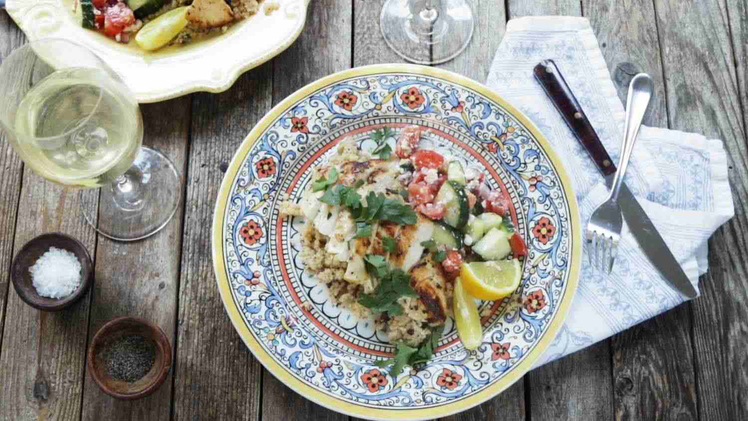 Zesty Lemon Chicken served with Couscous and Fresh Cucumber Salad.